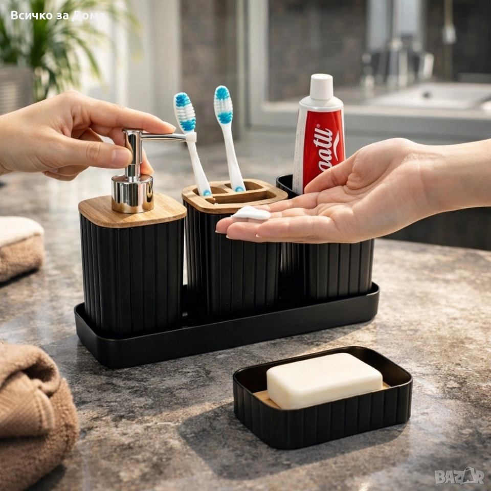 Тип продукт: комплект аксесоари за баня – 5 части; Табла / поставка – 25 × 9 × 2.5 см; Сапунерка – 12.8 × 8.3 × 3 см; Чаша – 17.5 × 7.5 × 10.6 см; Поставка за четки за зъби – 7.5 × 7.5 × 11 см; Диспенсър за течен сапун – 7.5 × 7.5 × 17.5 см; Материал: устойчив материал, подходящ за влажни помещения; Поддръжка / почистване: лесно почистване с влажна кърпа; Приложение: за домашна и гостна баня.