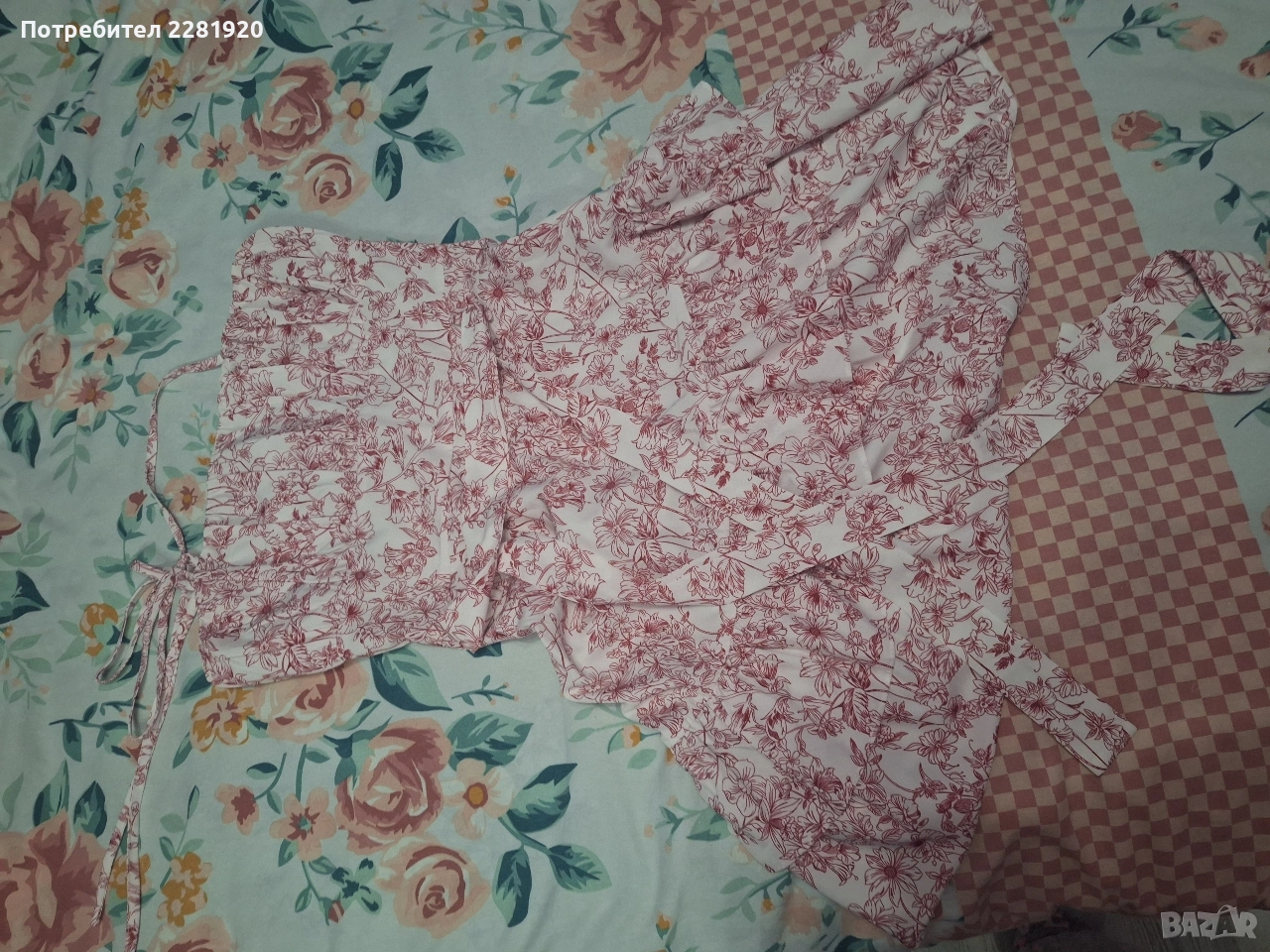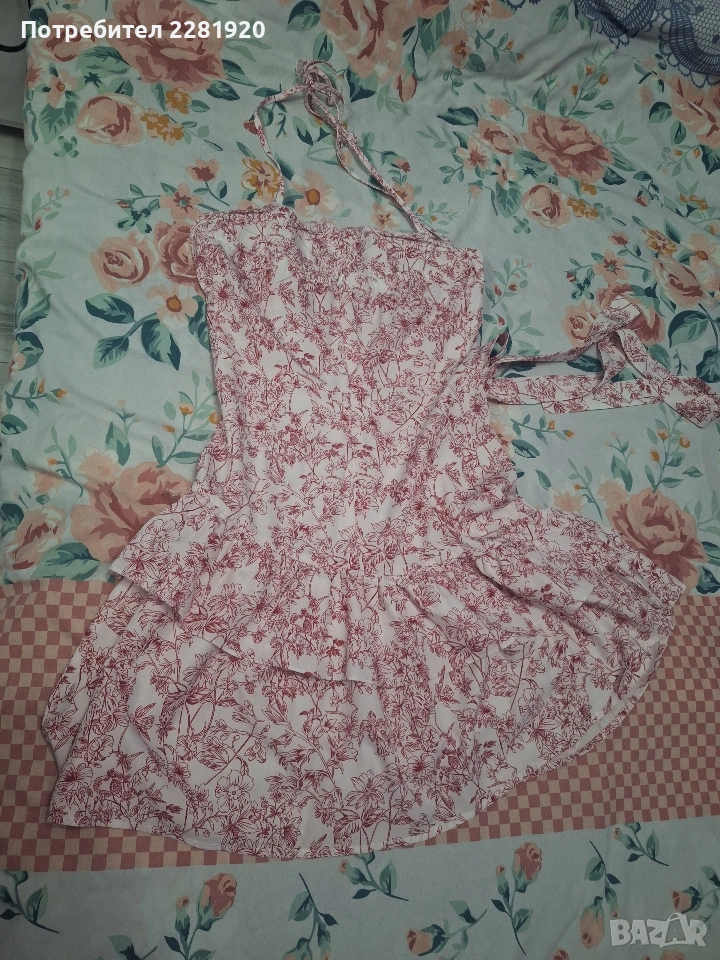4. Лятна рокля с розови мотиви Описание: Романтика и лекота в едно. Роклята е с нежни флорални мотиви, тънки презрамки и закачливи волани, които придават обем и женственост. Материята е тънка и дишаща – спасение за летните горещини.