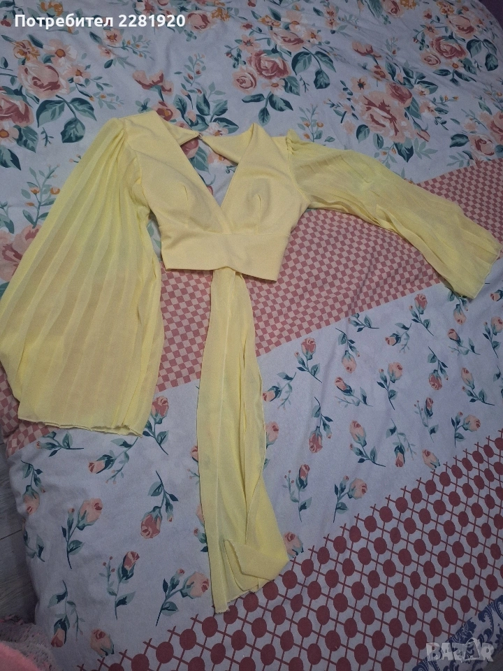 1. Жълт топ с гол гръб и ефектни ръкави Описание: Истинско слънчево бижу! Топът е с много интересни, феерични ръкави и секси гол гръб, който се регулира с връзки на талията. Цветът е нежен и свеж, идеален за лятото или специално събитие.