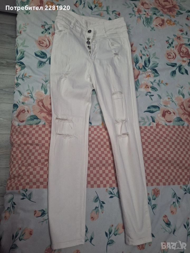 2. Бели накъсани дънки Описание: Класика за сезона! Снежнобели дънки с висока талия и ефектни "distressed" детайли. Моделът е еластичен, тип skinny, и стои страхотно с токчета или кецове. Изключително удобни за ежедневието.