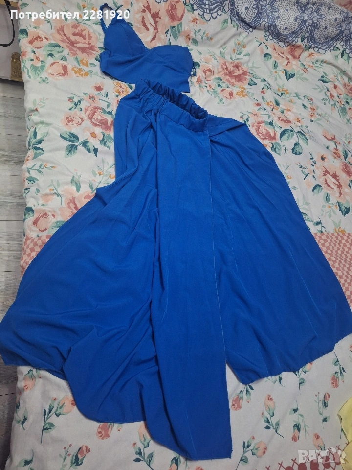 3. Кралско син сет от две части Описание: Ефектен комплект за дами, които обичат да изпъкват! Състои се от кроп топ (бюстие) и дълга, ефирна пола с висока цепка, която придава много грация при движение. Цветът е наситен и много модерен.
