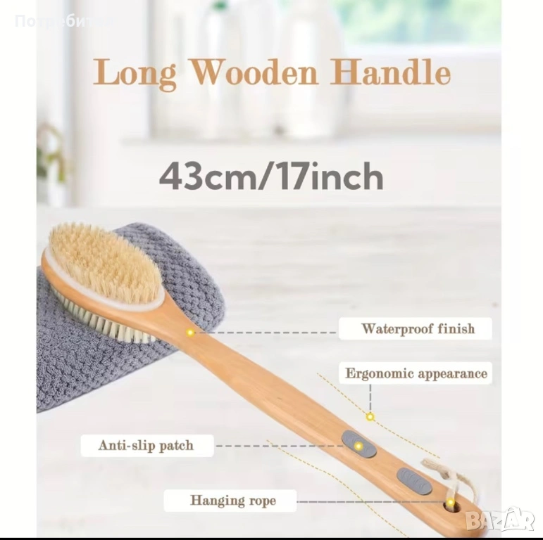 Двустранна четка за баня с дълга ергономична дръжка с добър достъп до всяка точка на гърба .