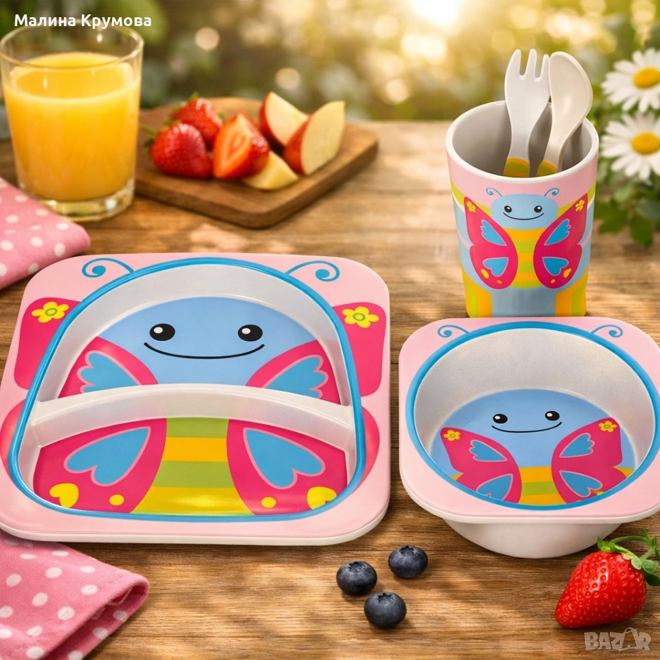 Детски комплект за хранене 5 части Cheffinger – чиния, купичка, чаша, лъжица и вилица → Обява 53167783