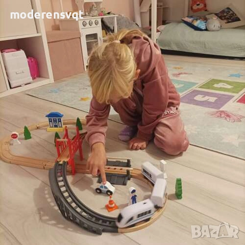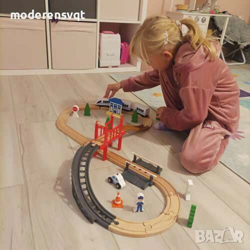 37 ЕЛЕМЕНТА – комплектът се състои от 37 прецизно изработени и красиво завършени елемента, които могат да бъдат аранжирани според вашата идея . Комплектът включва, наред с други неща, пътническа влакова линия, полицейска кола, комплект дървета и знаци, полицай, знаци и много други. Елементите на влака и железопътната линия са свързани с магнити - няма излишни кукички, които биха могли да се счупят и да създадат на детето постоянен проблем с разделянето на комплекта. Магнитите са силни - те не се пускат, дори когато целият комплект се повдигне.