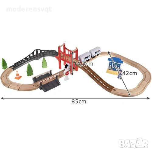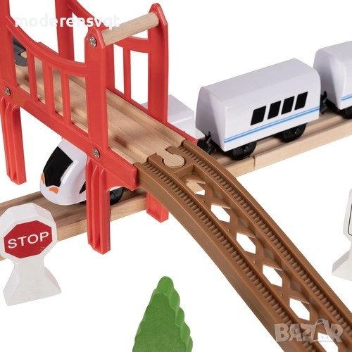 доминиращ материал: дърво, други: PP + ABS + желязо + магнит) в комплекта - 20 елемента релси, 5 дървета, 2 знака, 2 бариери, 1 пътнически влак, 1 полицейска сграда, 1 играчка кола, 1 пътен конус, 1 фигурка