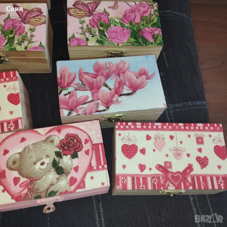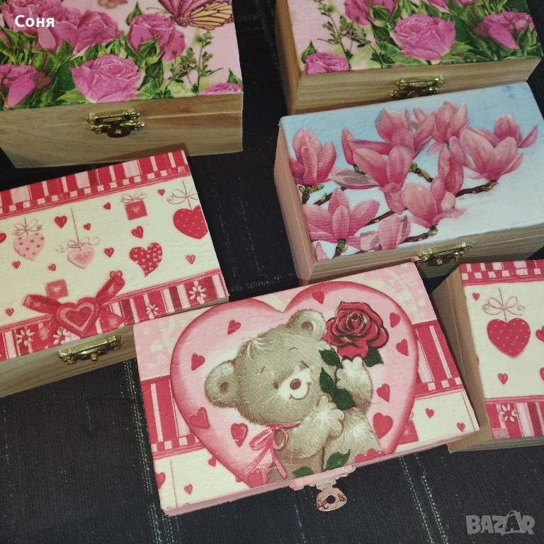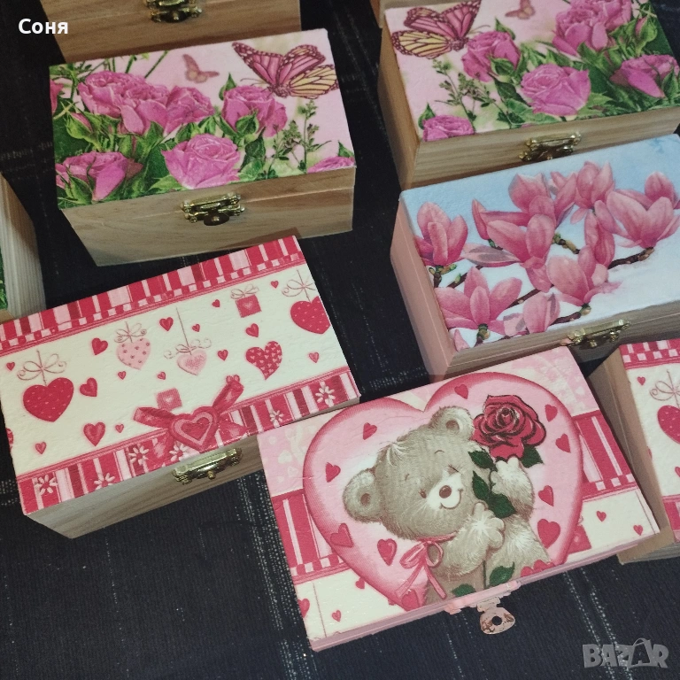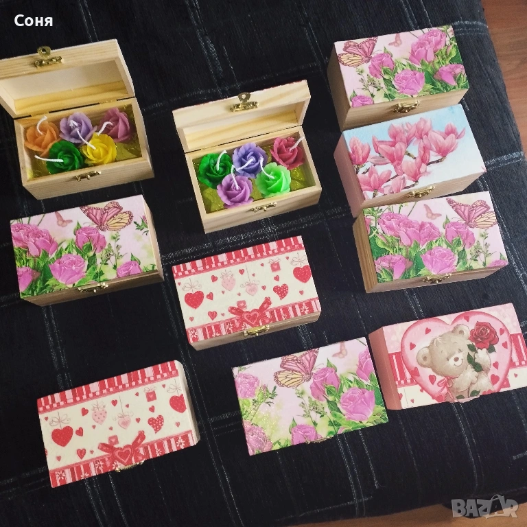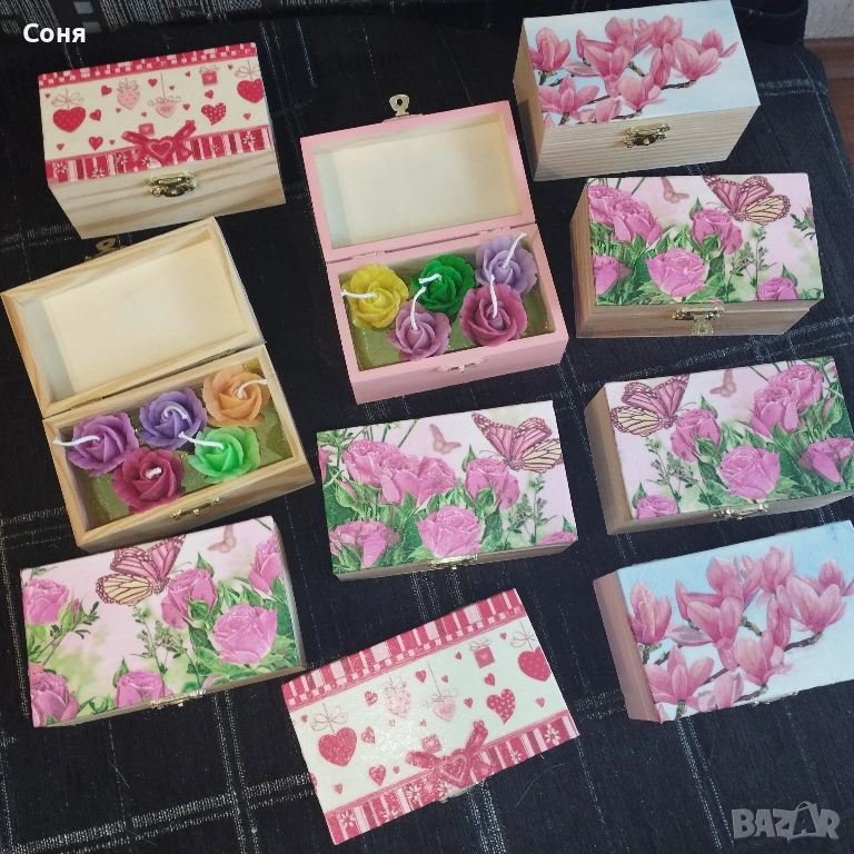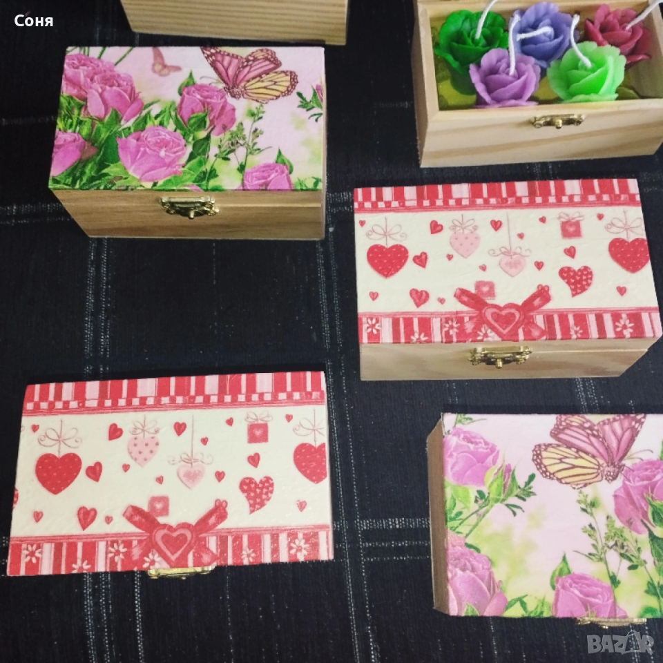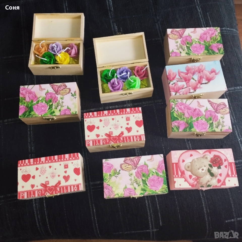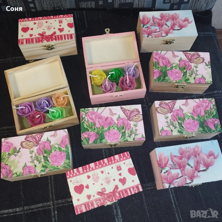 Дървена кутийка с пет ароматни мини рози - восъчни свещи, с размер на кутийката 12,5 см. дължина на 7,5см. ширина и 5,5см. дълбочина. Подходяща за всеки повод. Направена по метода декупаж. Налични са 10 кутийки.