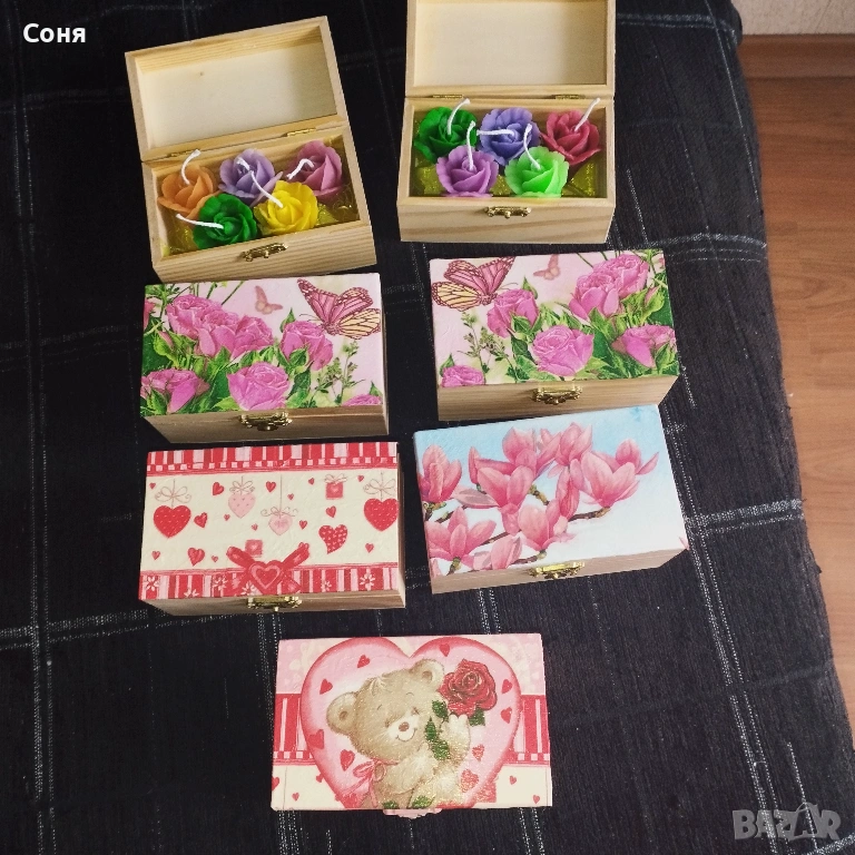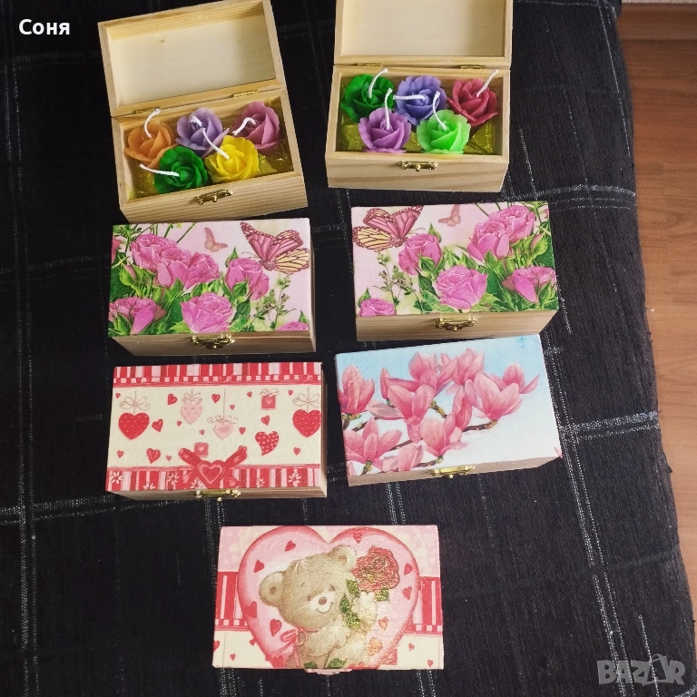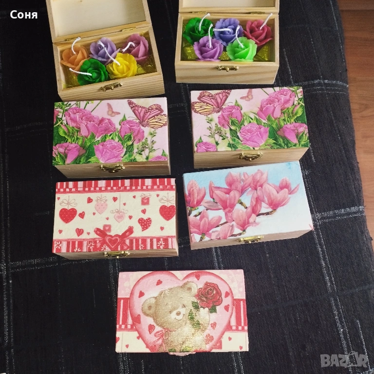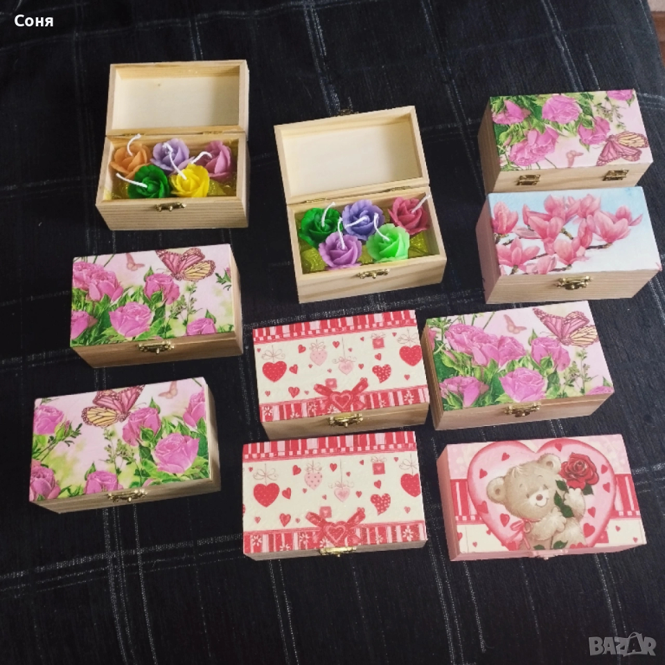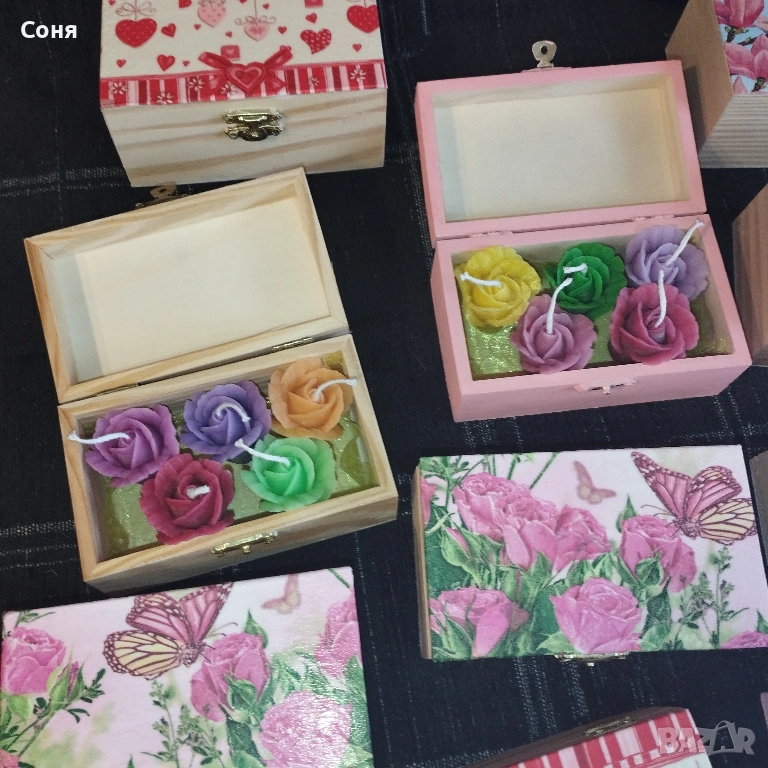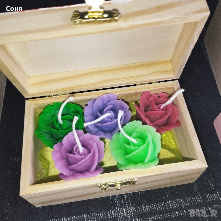 Дървена кутия с пет ароматни мини рози - свещ → Обява 53168163
