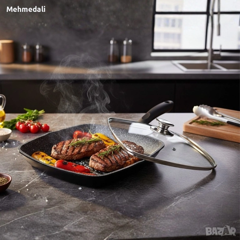 Грил тиган Cheffinger 28×28 см с капак – мраморно покритие → Обява 53168640