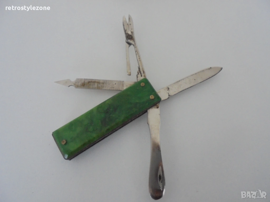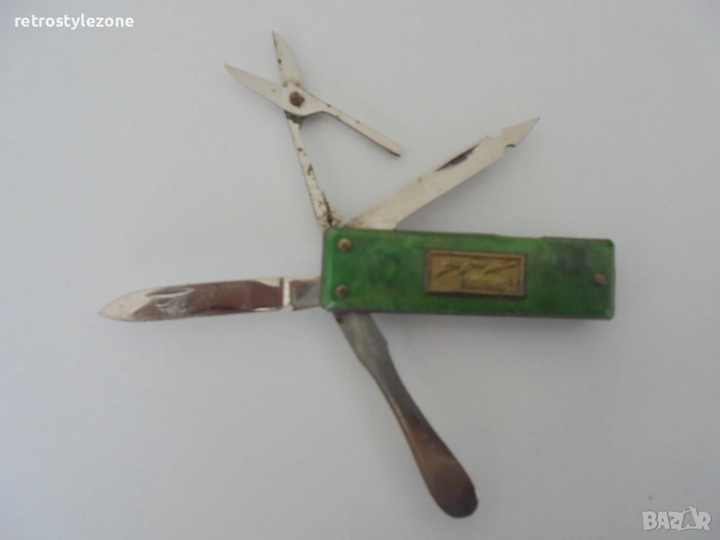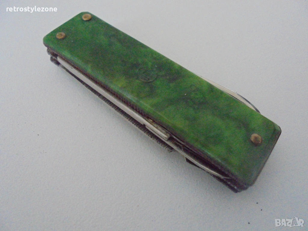 Ножчето разполага с няколко инструмента, типични за времето си, и оригинални чирени в зелен цвят с метална емблема. Видима естествена патина и следи от употреба, които допринасят за автентичността и историческия му характер.