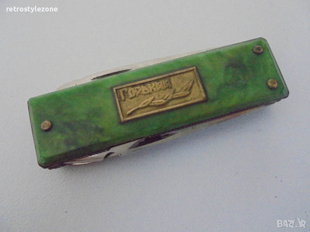 Старо руско многофункционално ножче „Горький“, автентичен предмет от социалистическия период, с висока колекционерска и антикварна стойност. Произведено в СССР, характерно за епохата със своята практичност и разпознаваем дизайн.