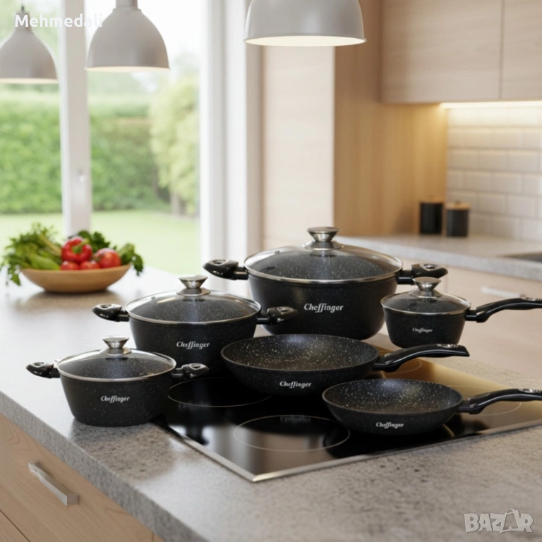 Комплектът съдове Cheffinger съчетава стил, качество и практичност за всяка кухня. Изработен от лят алуминий с 3-слойно мраморно/керамично незалепващо покритие и стъклени капаци, той осигурява равномерно разпределение на топлината и лесно почистване. Безопасен е за контакт с храна и не съдържа PFOA, олово или кадмий. Подходящ за ежедневна употреба и за всички видове котлони – газови, електрически, керамични и индукционни.
