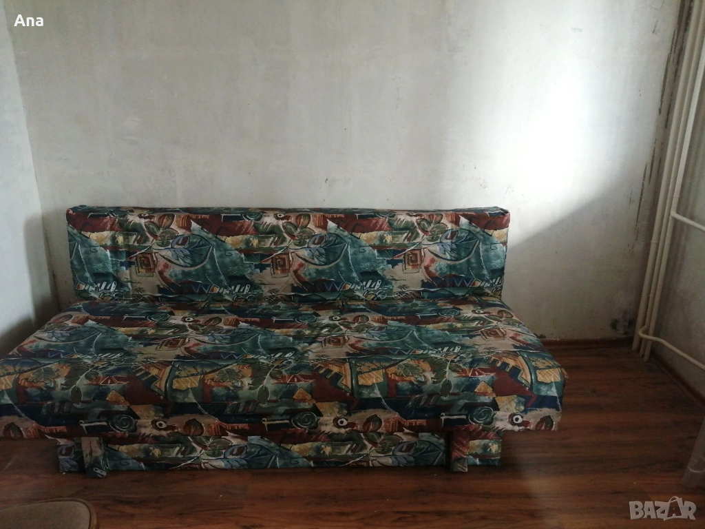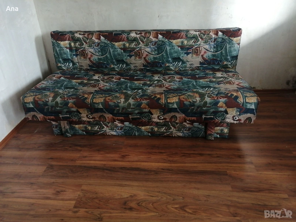 Разтегателен диван, който става и на двойно легло. С ракла отдолу и с две големи възглавници от същия плат, които не са снимани.
