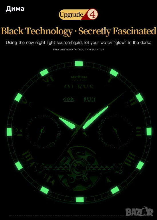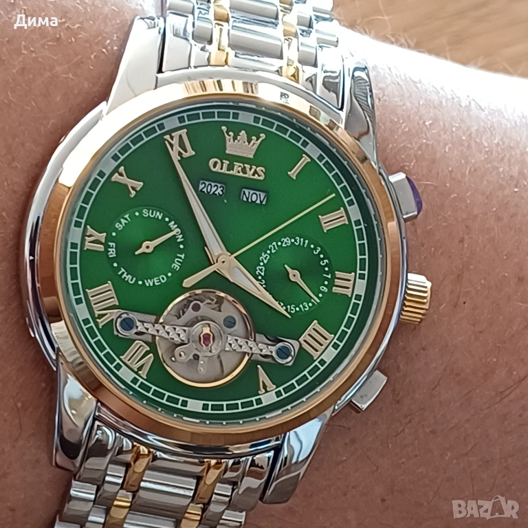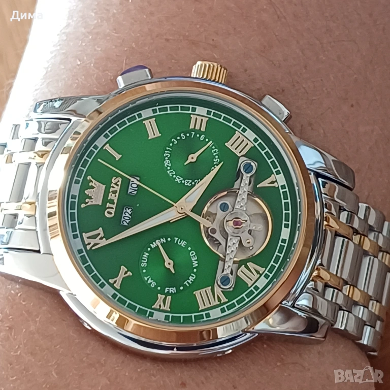 Olevs Автоматичен Мъжки Часовник, Дисплей, Скелетон, 3 ATM, Мултифункционален, Прозрачен гръб, Светещ, Индикатор Година, Месец, Дата, Ден.