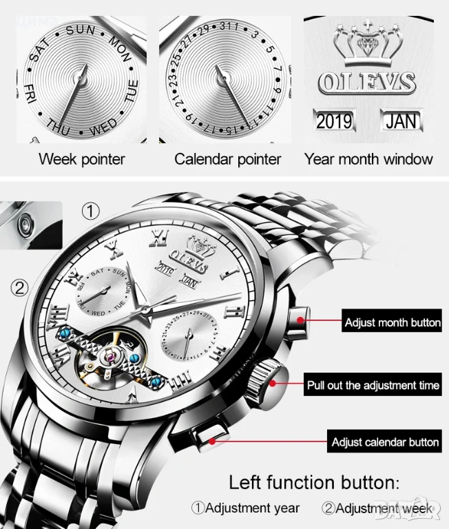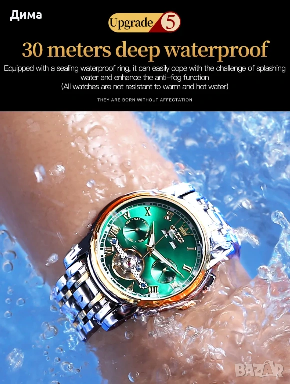Часовникът е Водоустойчив, Устойчив на надраскване, Многофункционална машина, Механичен Автомат, Може да се навива и ръчно. Фина стоманена каишка, Високо качество.