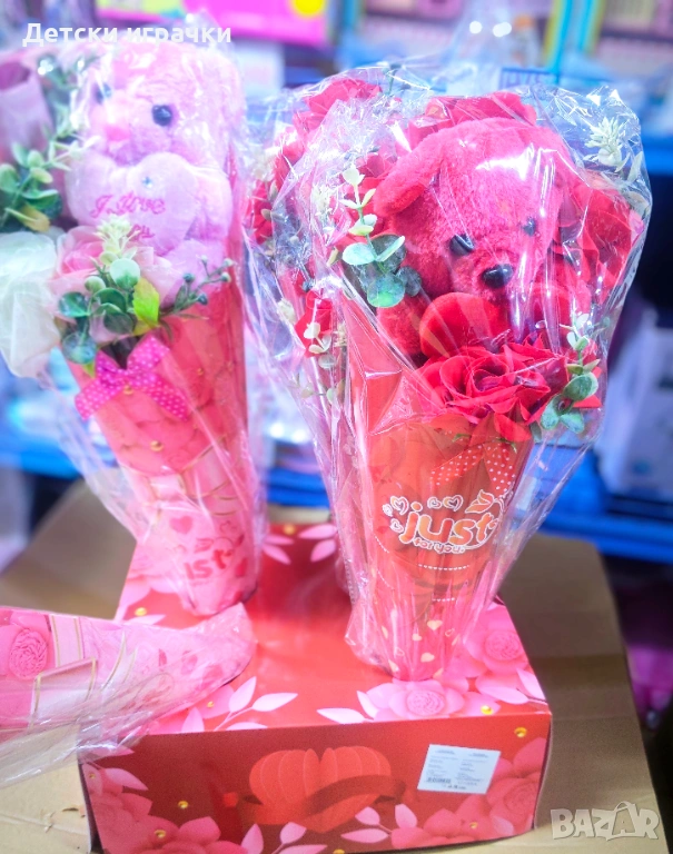 Съдържание: плюшено мече + изкуствени декоративни цветя;