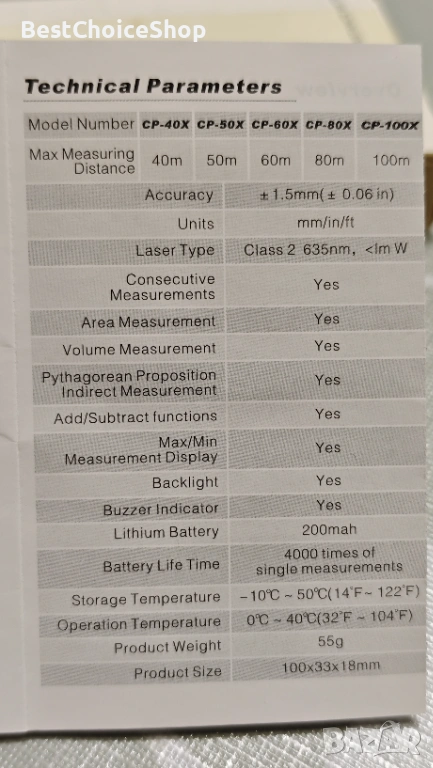 Обхватът на измерване на този лазерен далекомер е 0,05-100 м. Точността е ±1,5 мм.