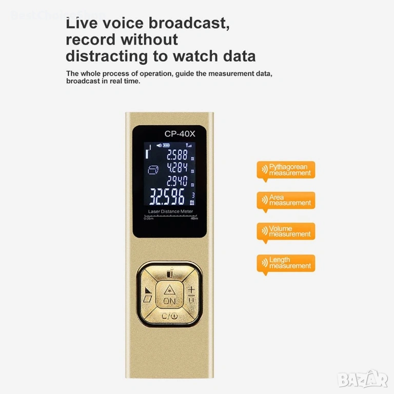 МНОГО ФУНКЦИИ: Устройството за измерване на разстояние има множество функции, поддържащи непрекъснато измерване, измерване на площ, обем и питагорова мерна единица, и може да превключва между три вида мерни единици, а именно m, in, ft.