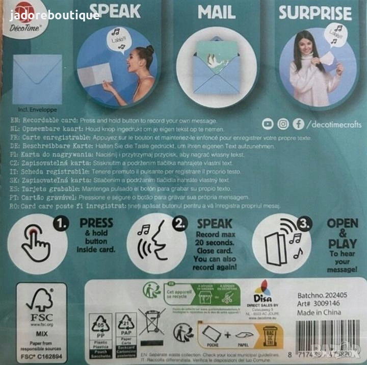 Инструкции : Натиснете и задръжте бутона, говорете, след което отворете картичката, за да чуете записа. Може да се презаписва.