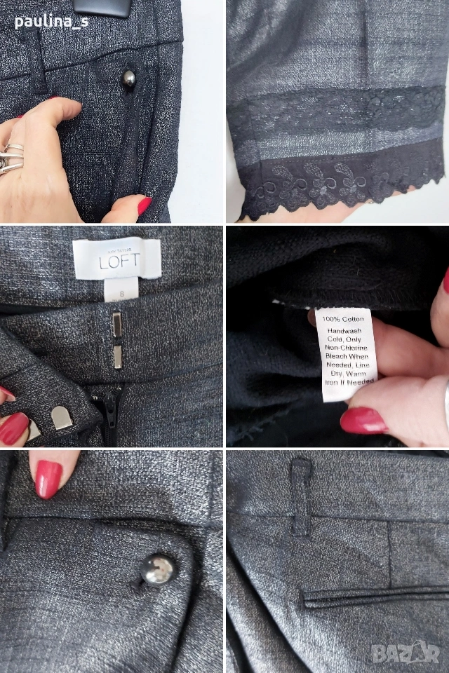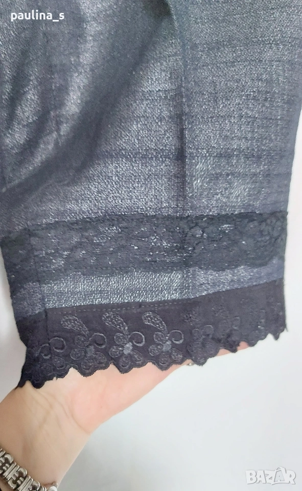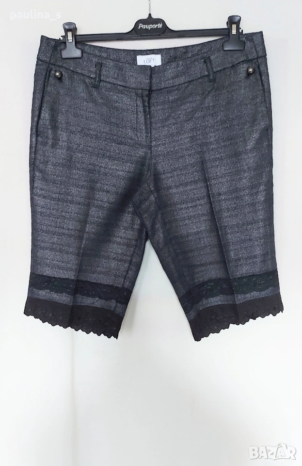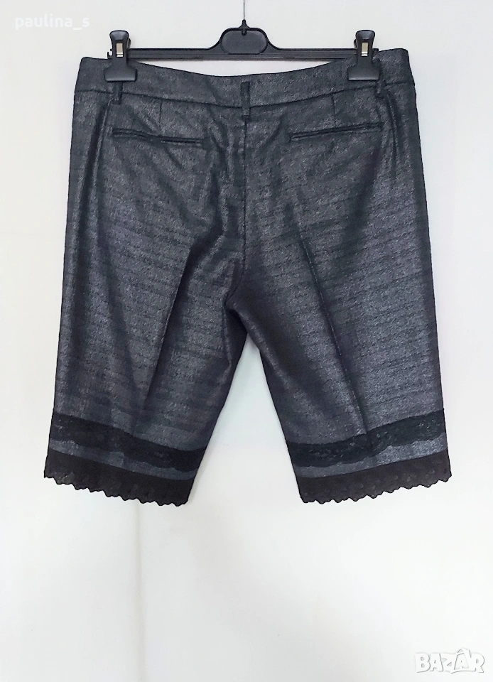 1️⃣ L / XL - "Loft". Цената е крайна, без пазарлъци 40 евро. Дамски бермуди, крачолите са декорирани от мен. Платът е плътен, релефен памук, не е еластичен. Покрит е с със сребърен блясък, не съм срещала такава обработка на плат. Крачолите завършват с по 2 ленти от рязана бродерия, талията е ниска, а копчетата са черни метални полусвери. Джобовете отзад са ефективни. Дрехата е страхотен шедьовър с бутикова стойност и цена. Брандът е дизайнерски, династията Тейлър е известна. Един от най-атрактивните, които съм срещала, характерен с невероятното качество и уникалността на всеки артикул без серийни производства. Отговарят на размер 42, стават и за 40EU с колан, за 44EU с тесен таз. Лична колекция.