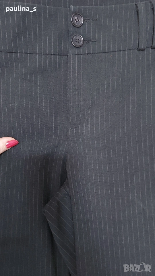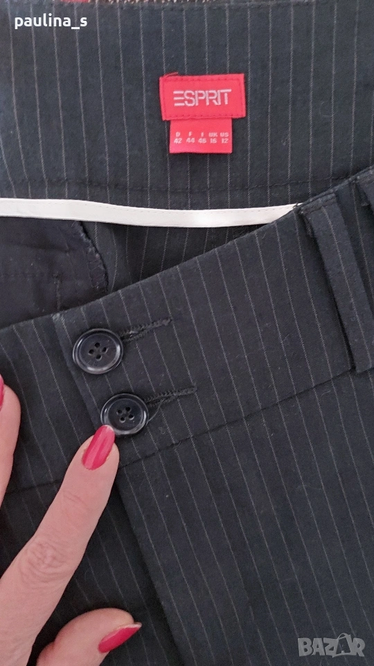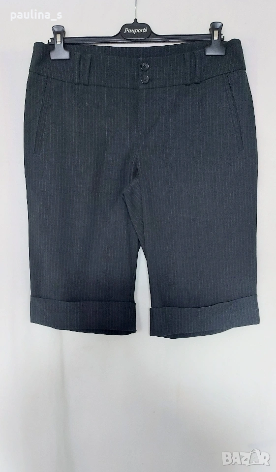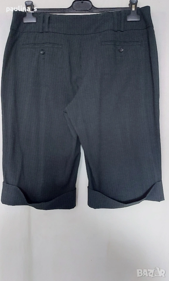 2️⃣ L / 2XL - "Esprit". Цената е крайна, без пазарлъци 20 евро. Дамски еластични брандови бермуди. Талията е нормална, цветът е антрацит със сиви райета, долу завършва с маншети, изчистен и много елегантен модел, подходящ за всички сезони. Платът е немачкаем габардин, плътен. Без дефекти, една бройка, по етикет е 42EU, но става и за 44EU.