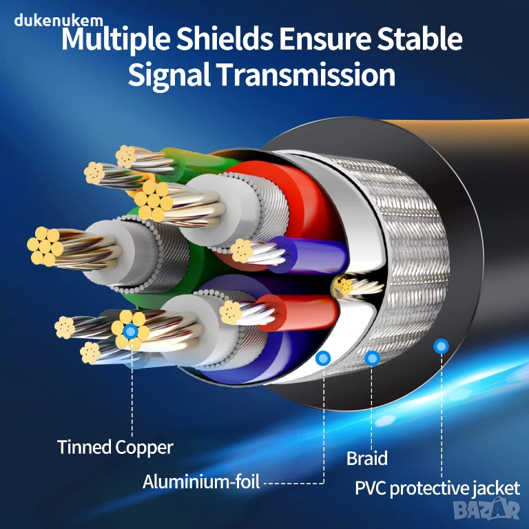 Материал: PVC кабел с метална оплетка и позлатени конектори