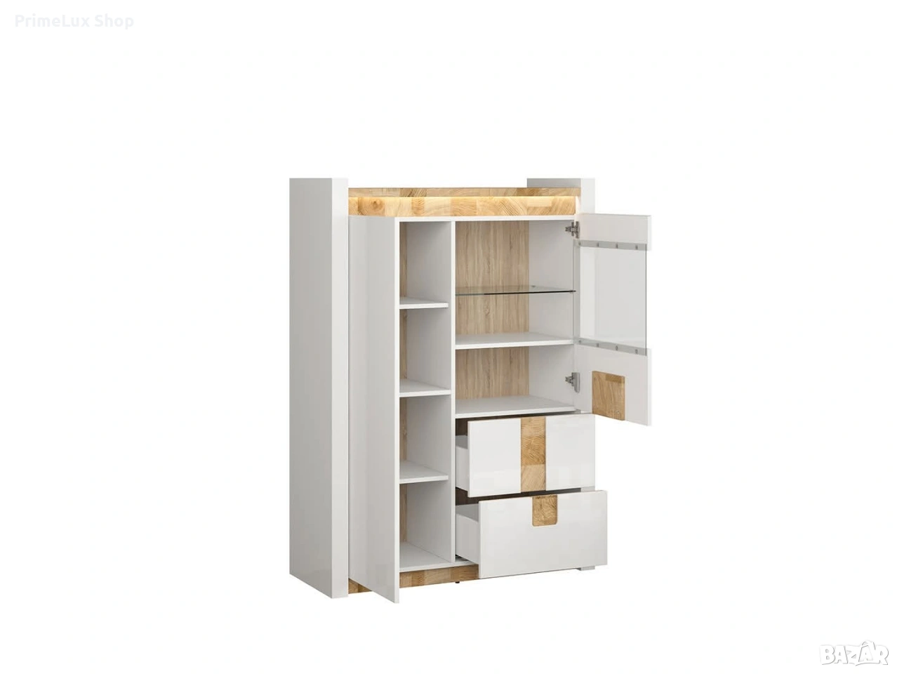 Витрина ALAMEDA REG1W1D2S бял лак/дъб уест/бял лак Материал - ПДЧ/МДФ/PVC фолио Цвят - бял лак/дъб уестминстър/бял лак Височина (см) - 141 Дълбочина/Дължина - 41 Ширина - 102 Тегло:66.20кг Доставка до 10 дни