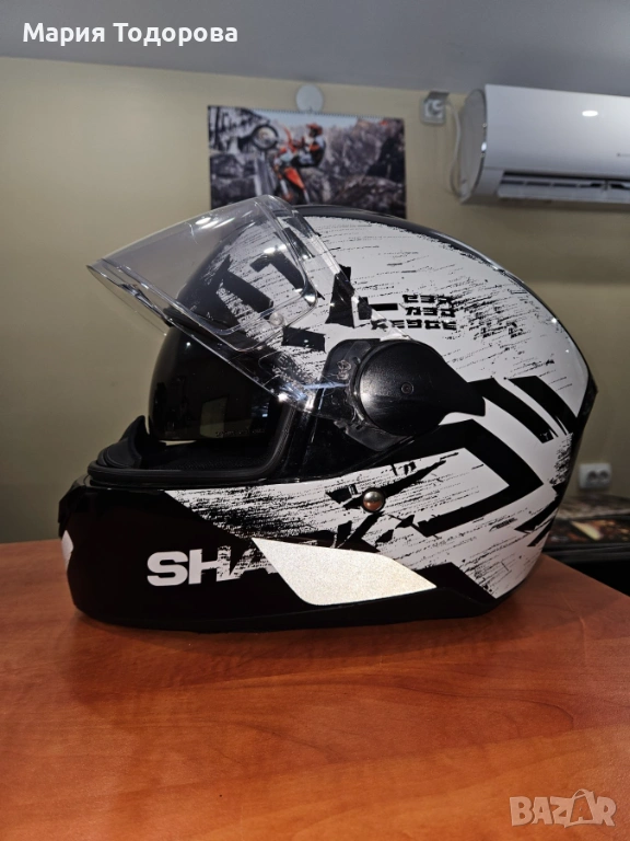 В отлично състояние, с вграден слънцезащитен сенник с UV защита, монтиран подбрадник и дифлектор. Допълнително са залепени светлоотразителни лепенки, които могат и да се отстранят.