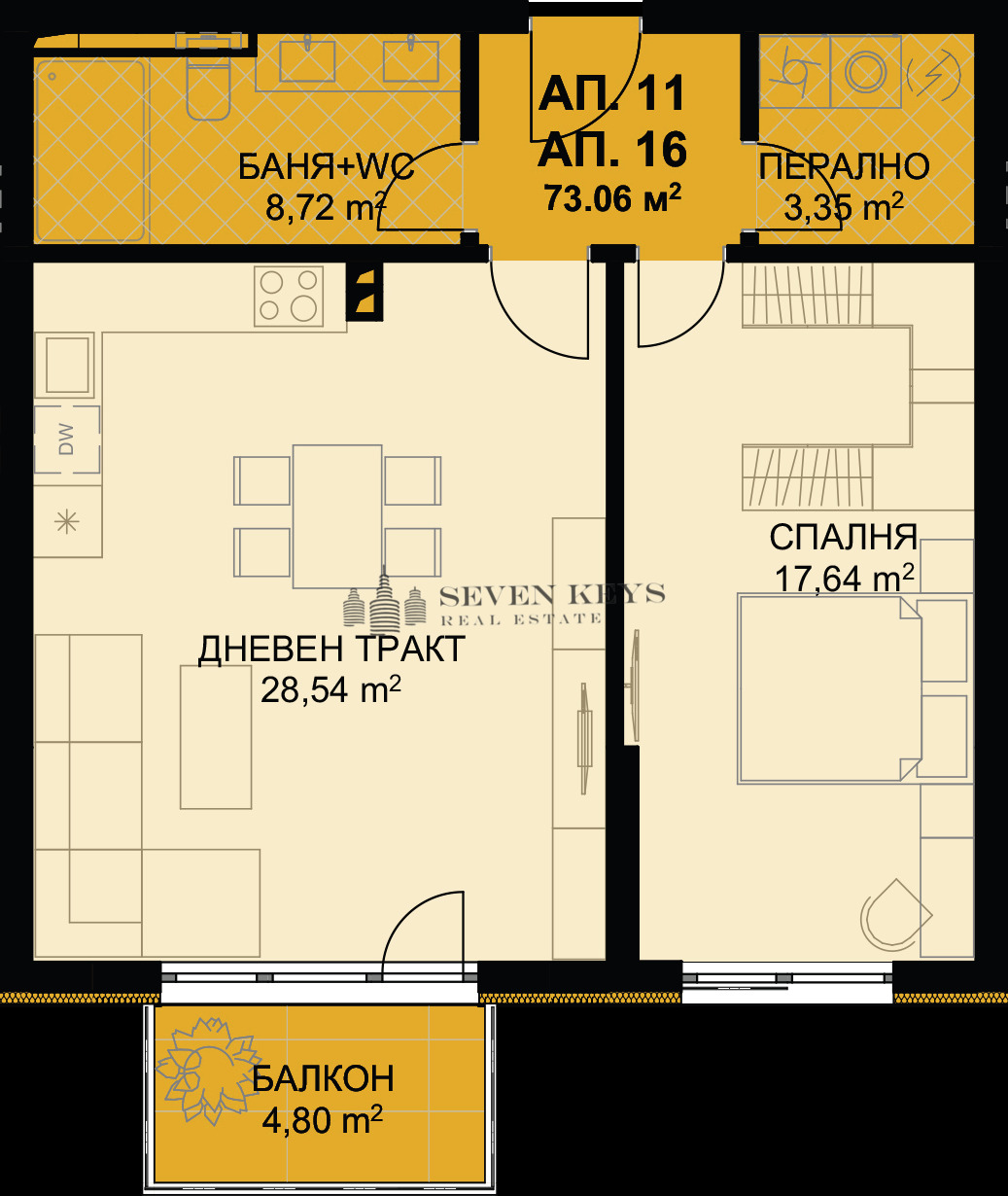 Жилището се състои от: дневен тракт с кухня, тераса, спалня, баня с тоалетна, перално помещение и коридор. Към апартамента има прилежащо избено помещение с площ от 6.22 кв.м.