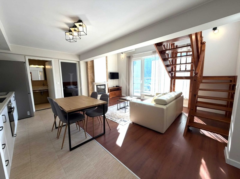 Красива дървена стълба свързва двете нива, която придава уют и елегантност на апартамента.