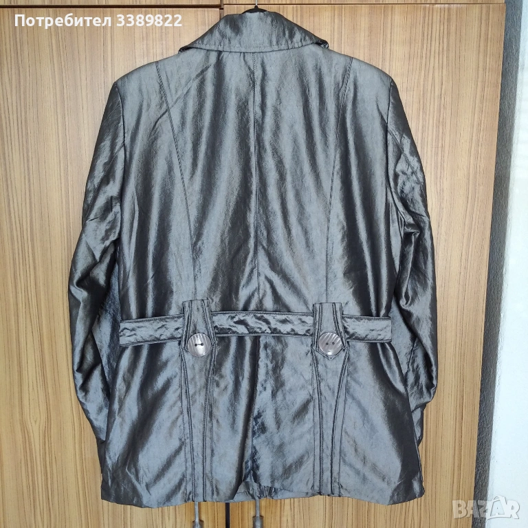 Продавам дамско яке - сребрист цвят, подвижен колан, два странични джоба, закопчава се с цип, размер е приблизителен около XL-XXL, дължина от рамото до долу 74см, дължина от външната страна на ръкава 65см, дължина от вътрешната страна на ръкава 48см, дължина от рамото до подмишницата 27см, гръдна обиколка едностранно около 55см.