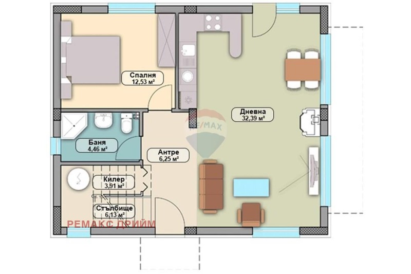 С обща жилищна площ от 158 кв.м., имотът представлява двуетажна къща, която разполага с: Първи етаж: входно антре, всекидневна, една спалня, баня с тоалет и килер.