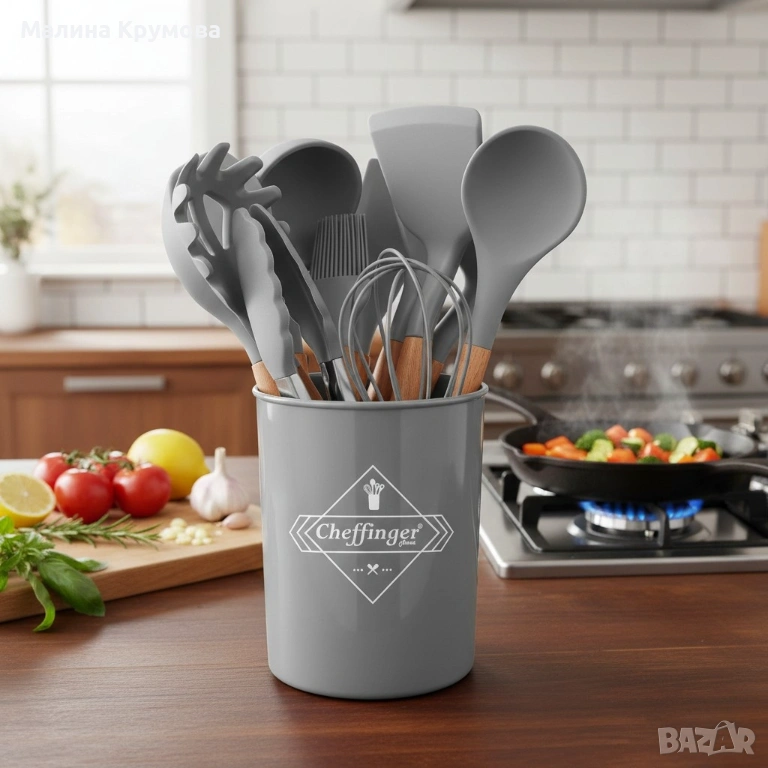 Комплект 12 части кухненски прибори със стойка Cheffinger – силиконови накрайници, дървени дръжки, т → Обява 53174525