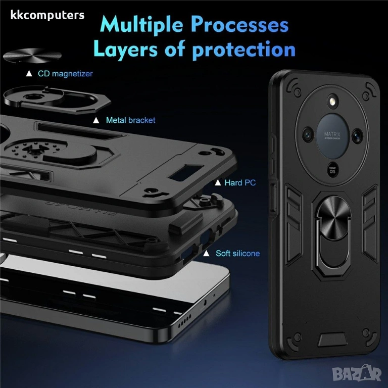 Този многофункционален калъф за Honor Magic8 Lite 5G, X9d 5G и X70 5G преосмисля защитата и удобството. Създаден от здрави PC и TPU материали, той предлага издръжливост за всекиден. Най-отличителната му черта е вграденото ротационно кръстче (Ring Kickstand), което служи както за стабилен регулируем стенд за гледане, така и за удобна опора за пренос. С допълнителна възможност за магнитна поддръжка в автомобил (благодарение на вградена метална пластина) и защитни повдигнати ръбове, този калъф е истинският швейцарски нож за вашия телефон. Комплектът включва скрийн протектор.