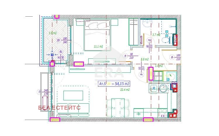 - Разпределение - антре, дневна с кухненски бокс и трапезария, спалня, баня с тоалетна, мокро помещение и тераса.