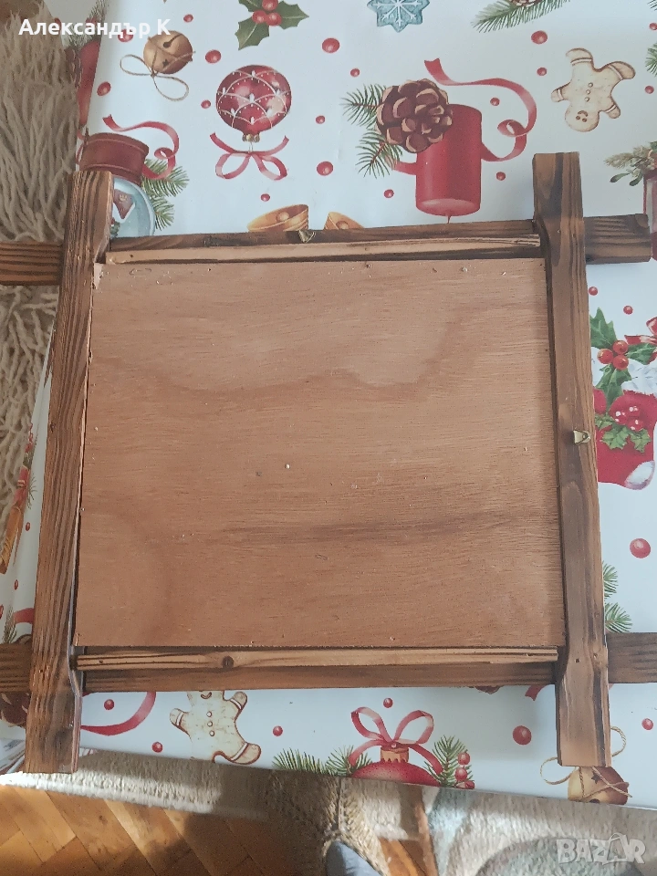 Красива дървена картина с изрязана къщичка и дървета. Рамката е изработена от дърво, а картината е изпълнена в дървен стил. Подходящ декоративен елемент за дома или офиса.