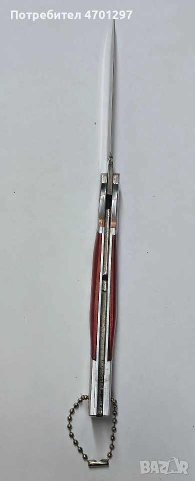 Метален, сгъваем нож с дървени елементи по дръжката. Размер на острието 10 см. Размер на целия нож 21.5 см. Размер в сгънато състояние 11.5 см.