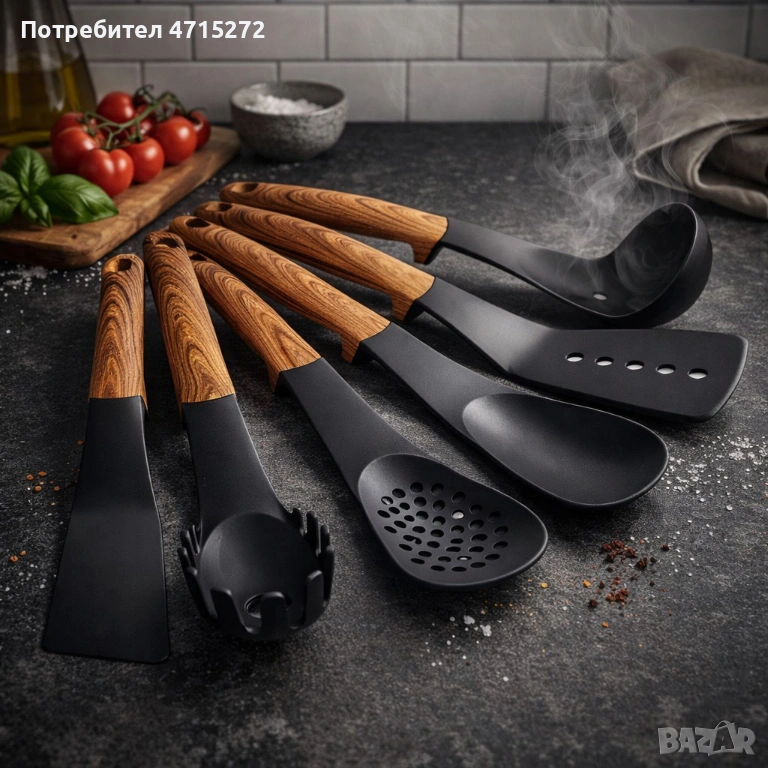 Комплект кухненски прибори 6 части с въртяща се стойка Cheffinger – дървесна визия, практичен и стил → Обява 53175451