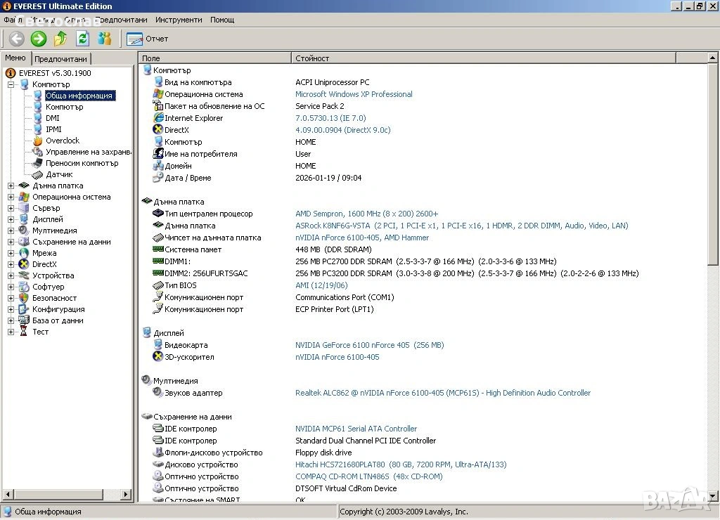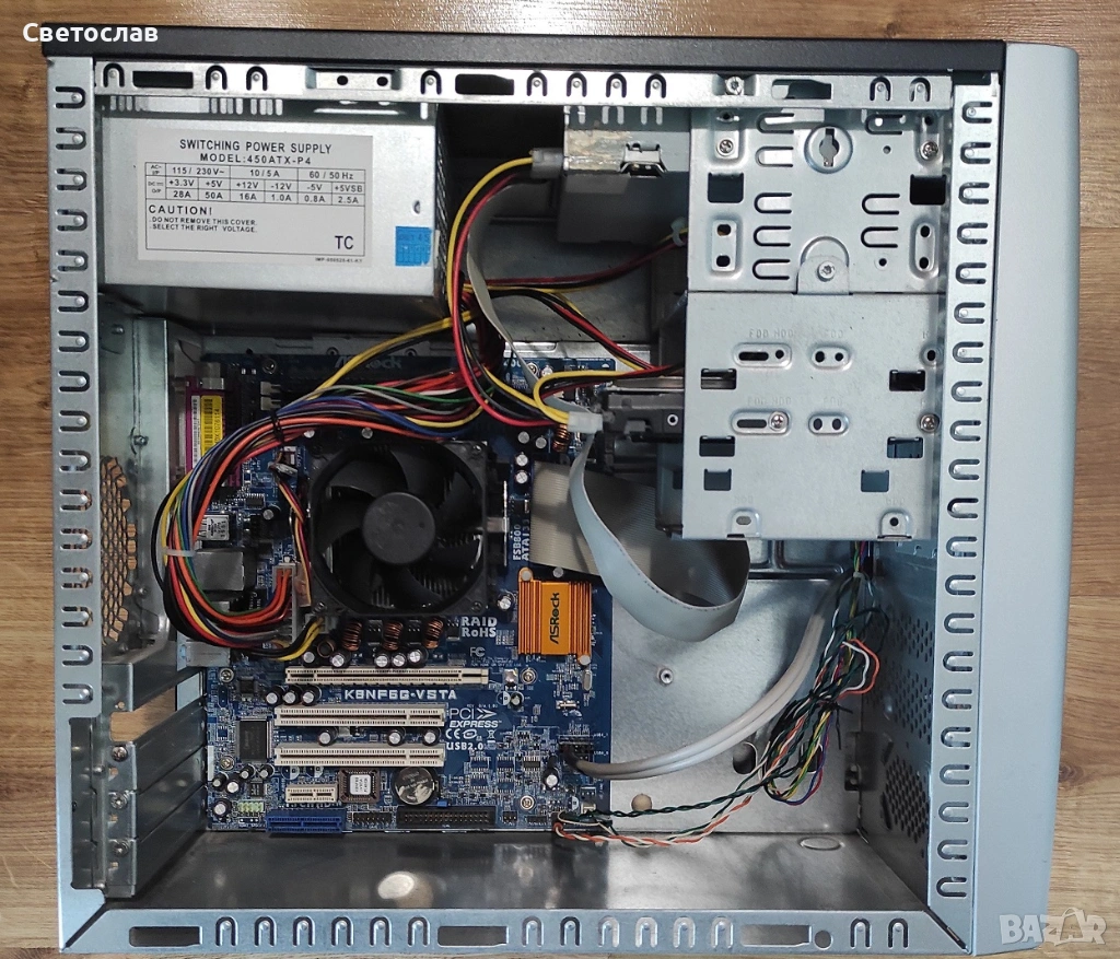 Дъното е ASRock и поддържа процесори на AMD Athlon и Sempron на сокет 754. Процесорът на него е АМД Семпрон 2600+ едноядрен , 64 битов на сокет 754 със реална честота от 1600 MHz.