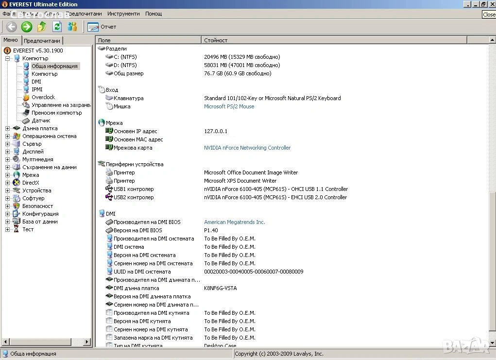 За комуникация компютъра разполага с вградена 100 мегабитова мрежова карта на Realtek.