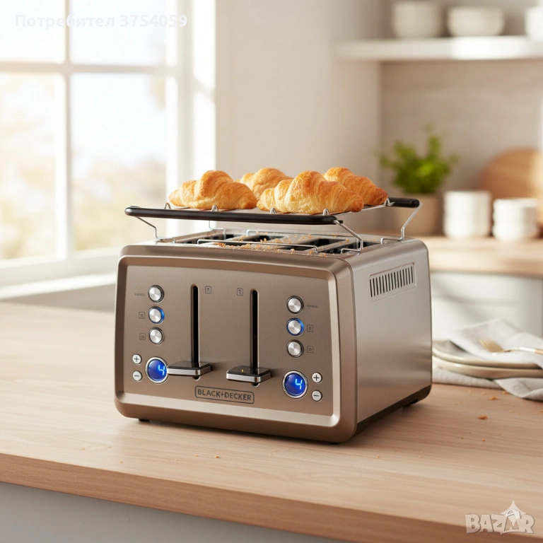 Мощен тостер Black+decker BXTO1960E - Неръждаема стомана с 4 слота, LCD дисплей и стойка за кифли