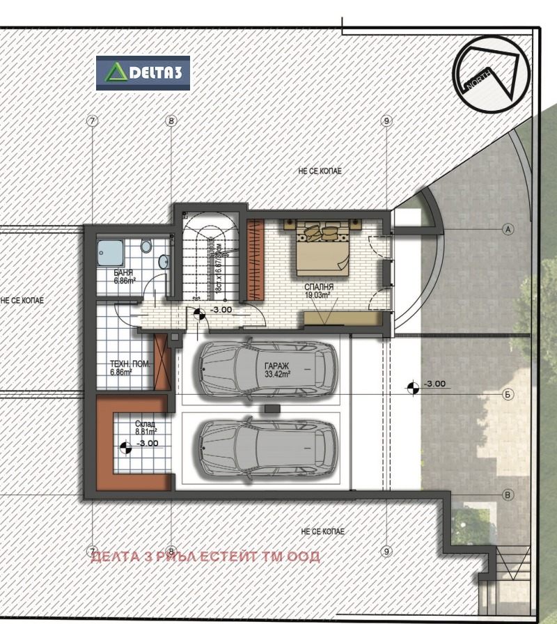 Приземен етаж: гараж за две коли, склад, техническо помещение, баня с WC.