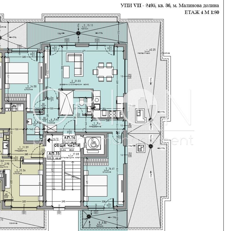 - Дневна с кухненски бокс 31,5 кв.м с възможност за усвояване на допълнителни 15 кв.м тераса