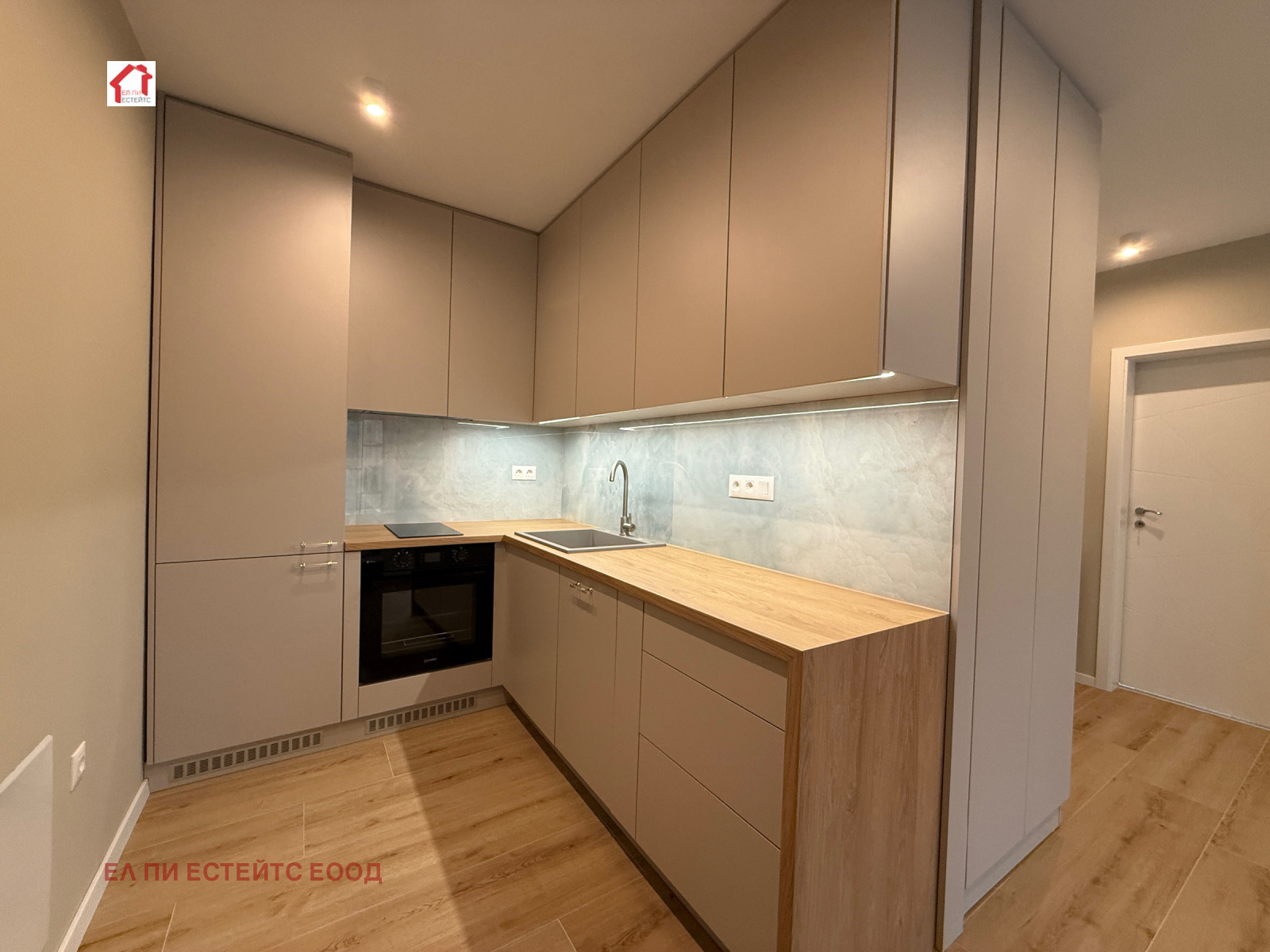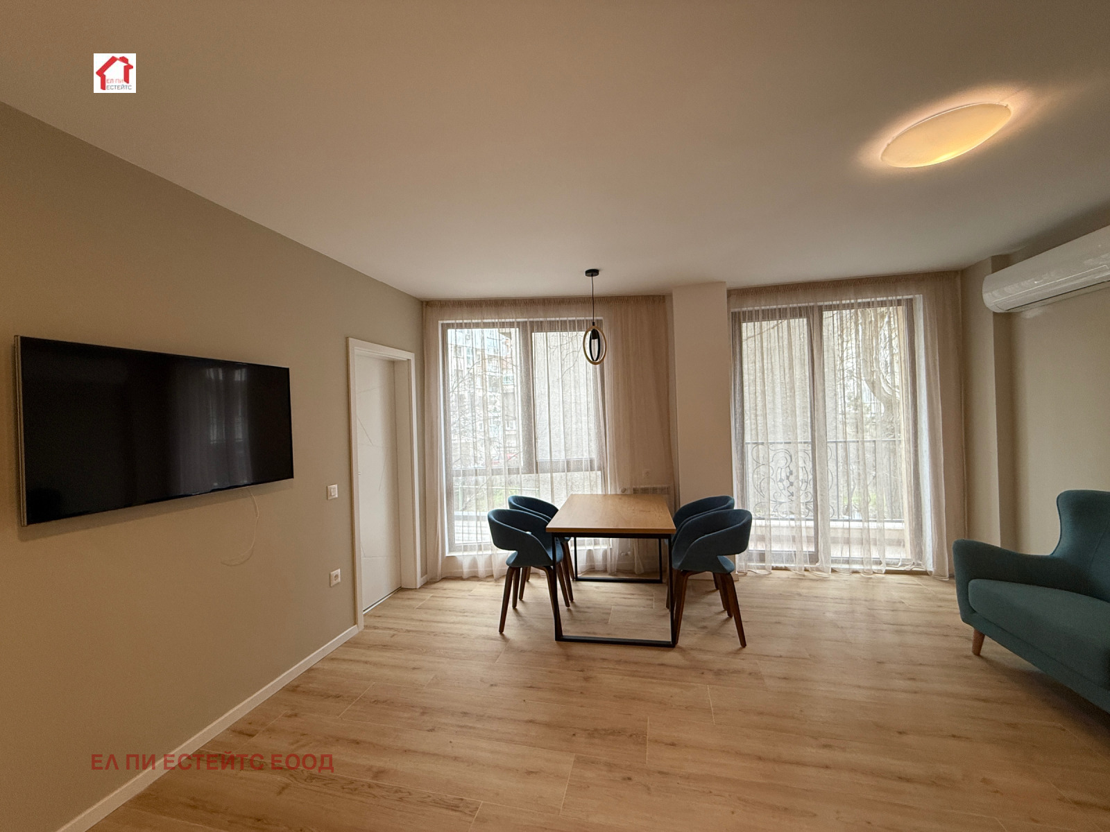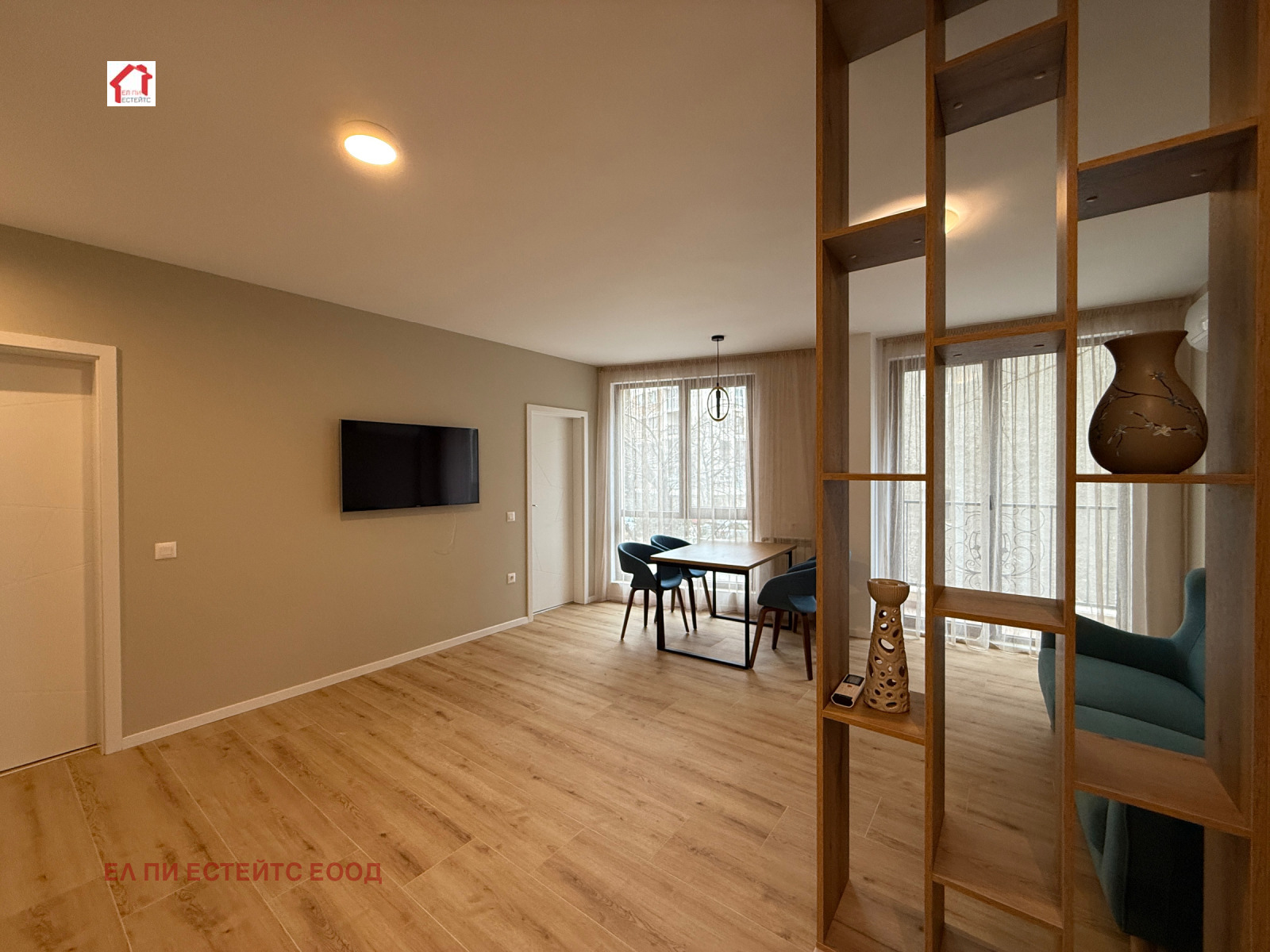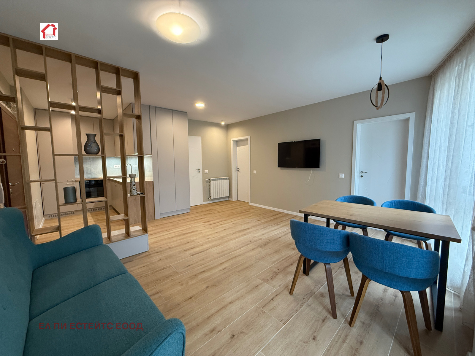 Дневна с кухненски бокс: Пространство с изчистени линии и обилна естествена светлина.