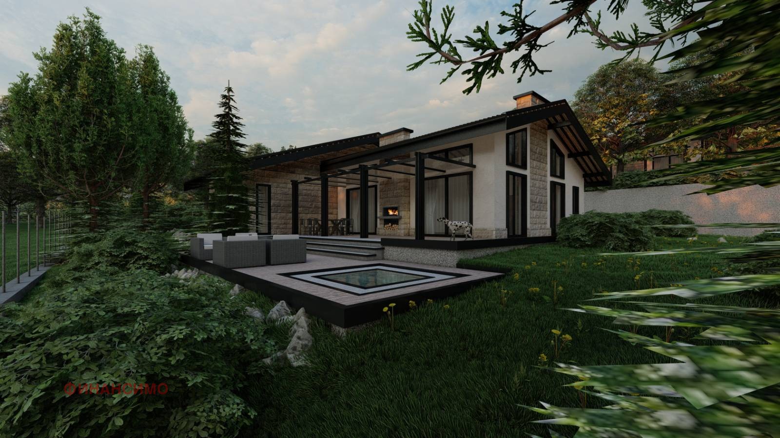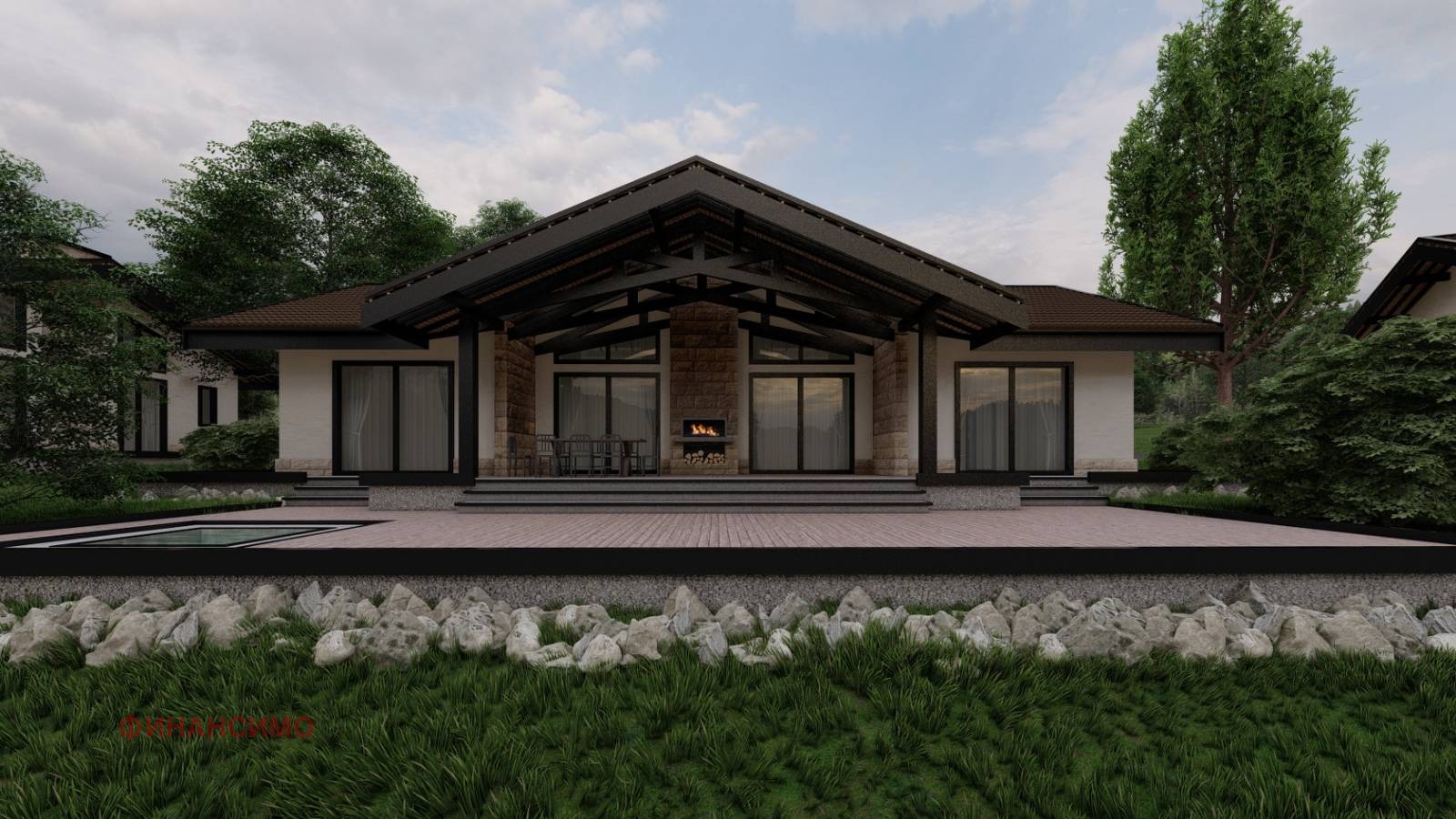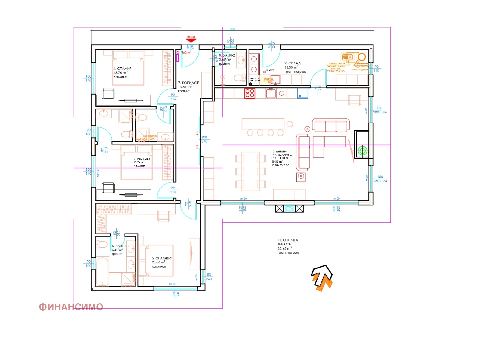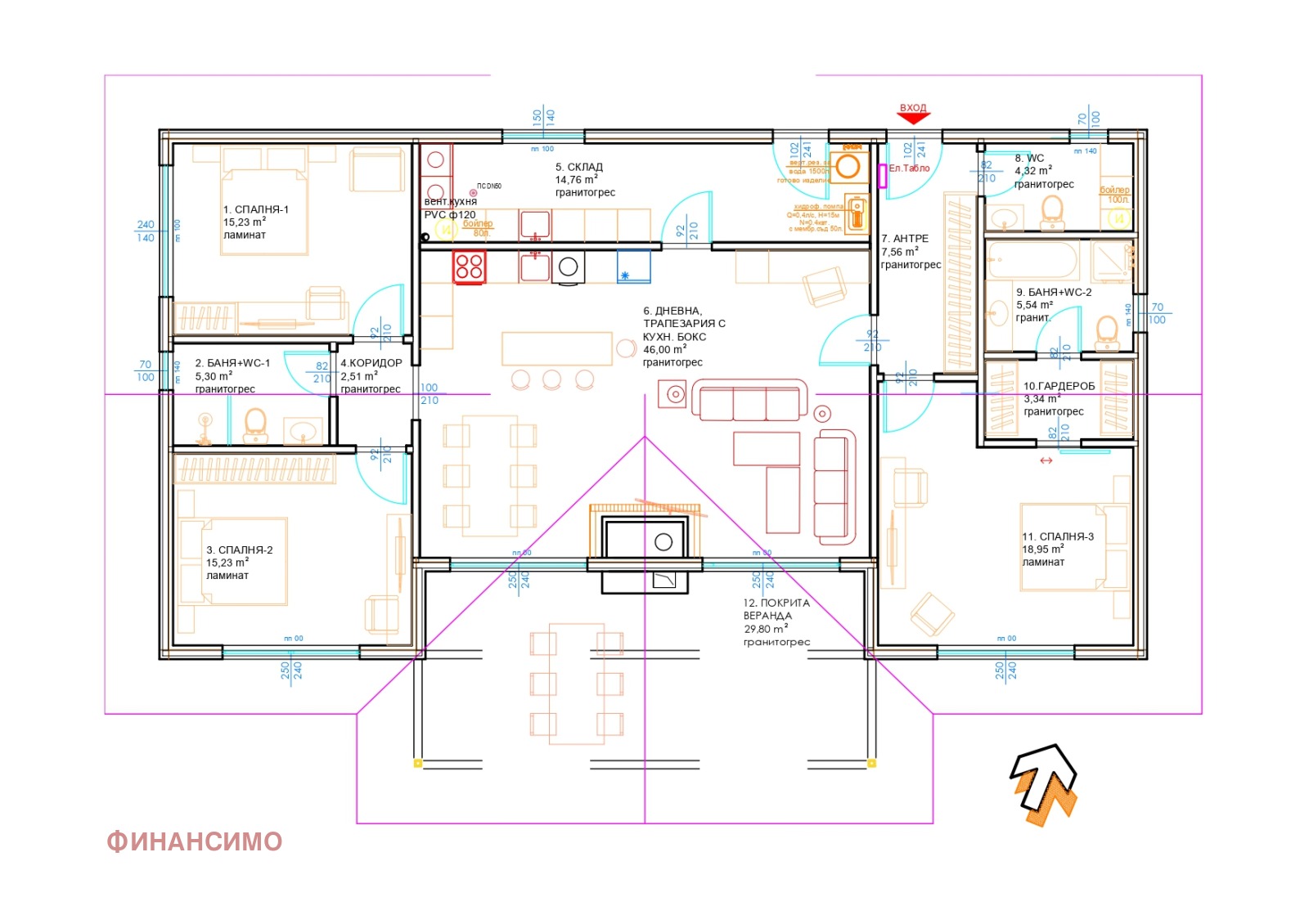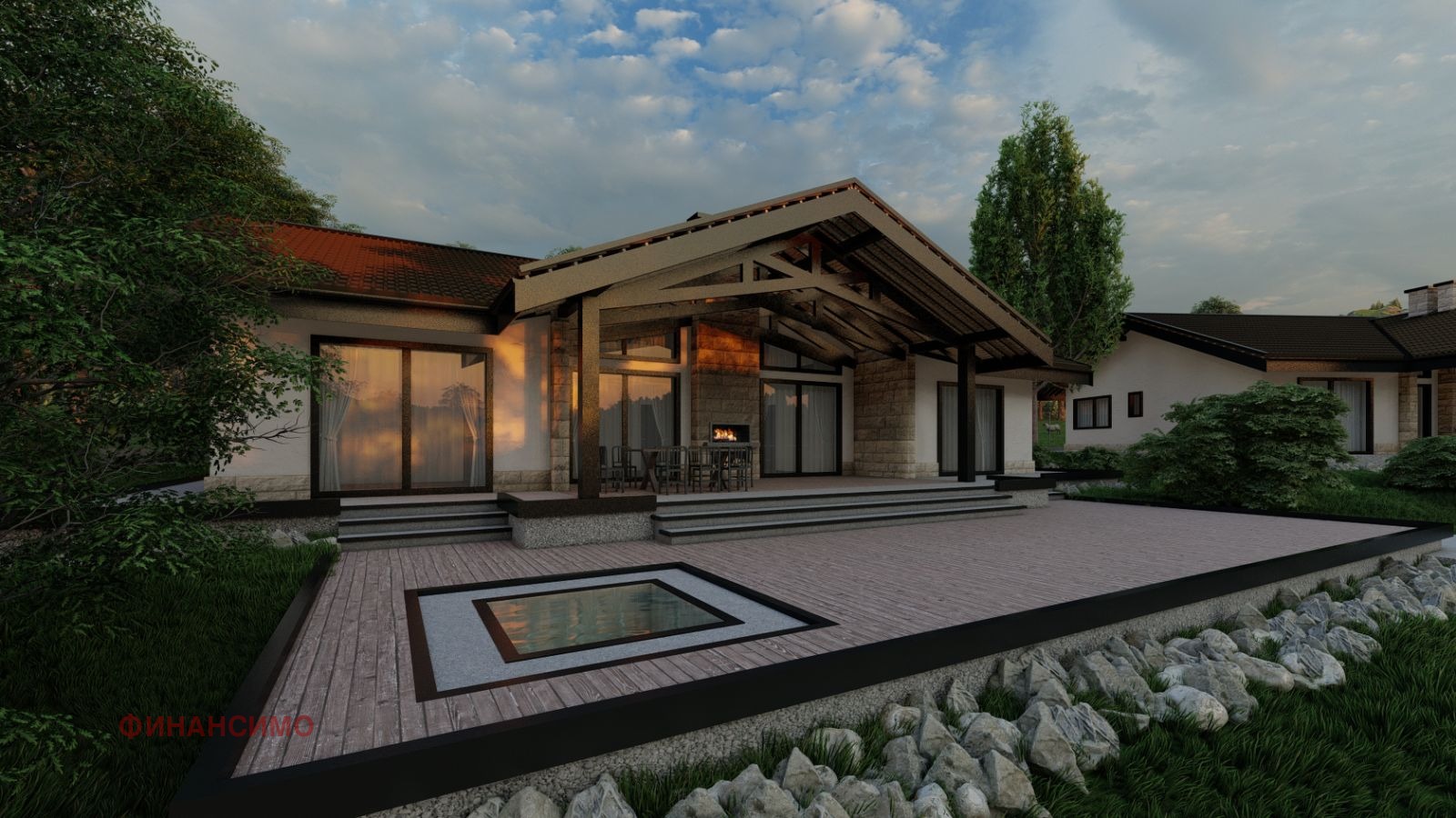 Разпределение на вилната сграда: входно предверие с коридор, светла дневна с трапезария и кухненски бокс, склад, 3 уютни спални, 3 бани и покрита веранда.