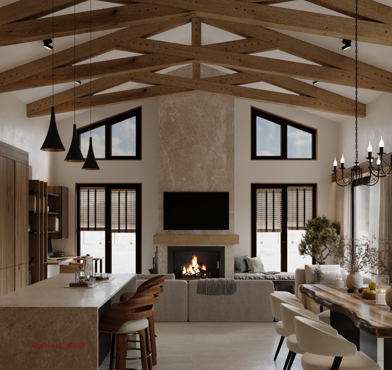 Помещенията са с височина 2.60 м. Дневната е с височина до скатен покрив 4.30 м., отдолу с видими дървени ферми.
