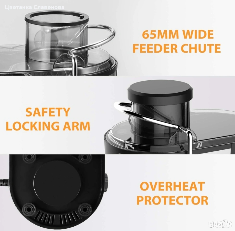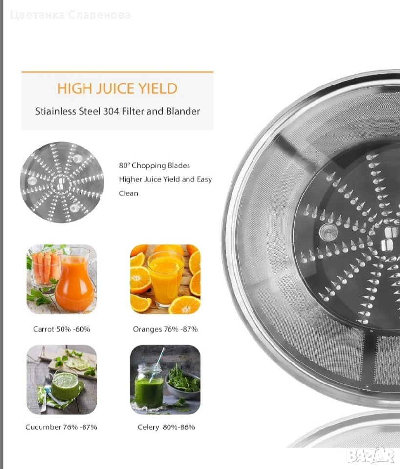 【Удобен размер】 Оборудван с кана за сок от 350 мл и контейнер за пулпа от 1200 мл. Отвор за подаване с ширина 65 мм, повечето цели плодове и зеленчуци могат да се поставят директно за изцеждане. Подходящ за лична употреба и спестява място в кухнята.