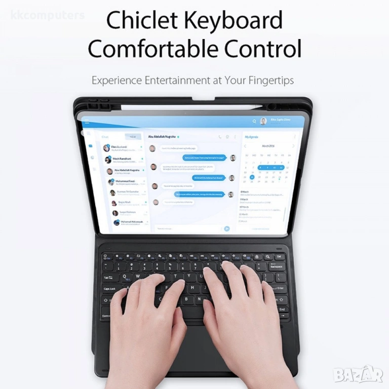 Комплектът включва калъф и отделяща се Bluetooth клавиатура с тъчпад.