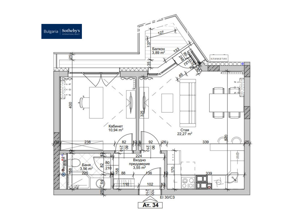Разпределение: дневна с трапезария и кухненски бокс, кабинет, балкон, баня с тоалетна.