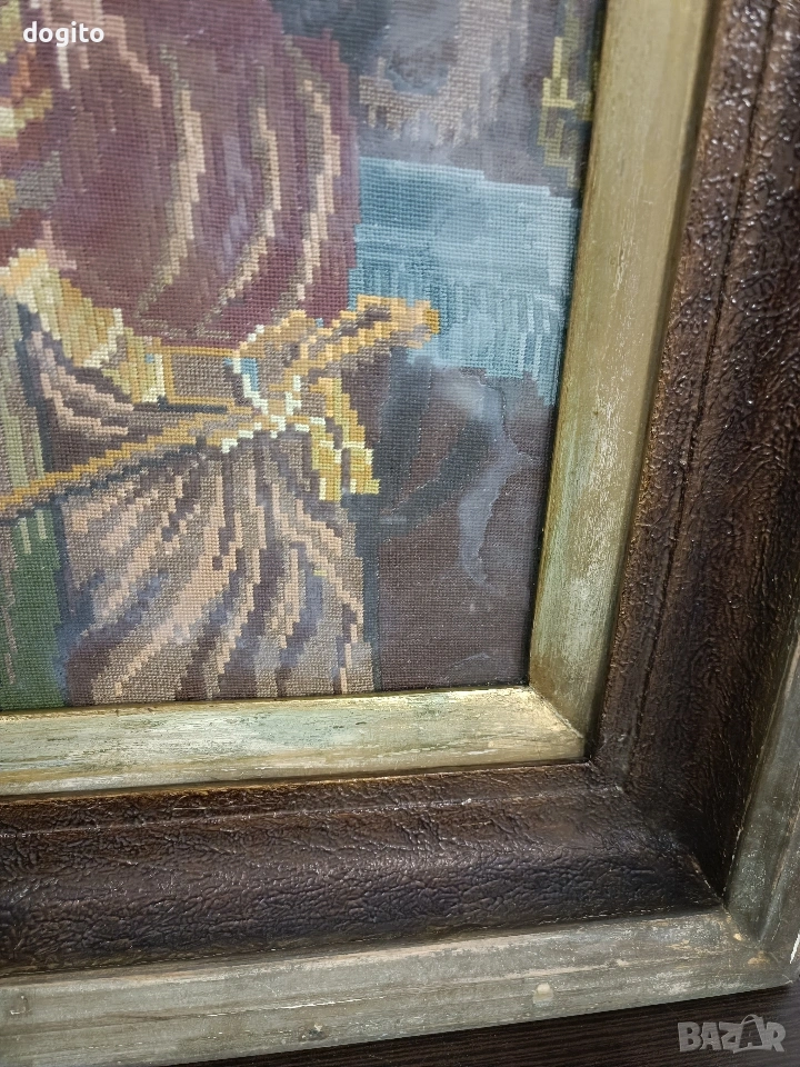 Продавам ръчно шит гоблен „Рембранд и Саския“, изработен на кръстат бод по класическия модел. Гобленът е шит с памучни конци тип мулине, с много фини цветови преливки и плътно покритие. Поставен е в масивна дървена рамка, която отлично подхожда на стила и има собствена декоративна стойност. Сюжетът е по известната композиция „Рембранд и Саския“, класически и търсен мотив. Самият модел се предлага отделно на висока цена.