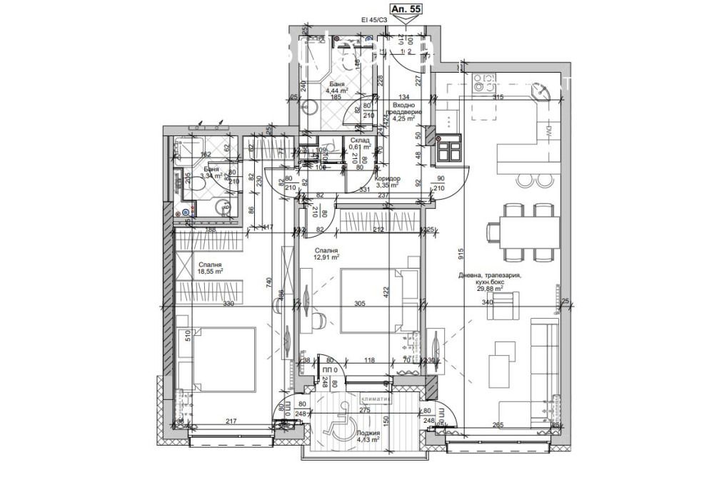 Разпределение: дневна с трапезария и кухненски бокс, лоджия, две спални, две бани с тоалетни, склад.